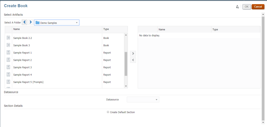 Notice the Datasource drop-down. This section displays the data source for the selected reports and Books. You make the change here, not in a completely different section in the repository. As I mentioned before, one limitation in Narrative Reporting is only one data source can be used in the Book. Additionally, in Section Details, you can create a default section to group all the selected documents and select the desired POV dimensions for the Section. Sections can be used to group multiple documents under a common Table of Contents entry and run reports for a common Point of View.
